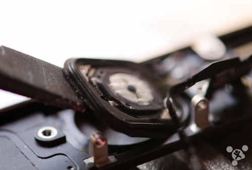 3,用撬刀小心翼翼把 Home 鍵撬出來,有粘合劑固定著,所以撬起來沒那麼方便。要非常小心,防止撬壞連接 Touch ID 的電線。