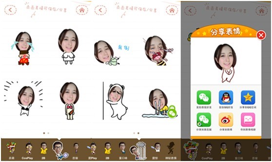 選定了頭像後表情就開始生成啦,底下有賣萌、Cosplay、2B、重口味、悲催、震驚以及神秘表情等不同風格的動態圖,只要點擊你感興趣的主題就可以實時預覽表情效果,遇到喜歡的表情點擊就能直接分享到微信、微博等社交平台,當然,如果你是個小嬌羞,也可以默默的把喜歡的表情保存在“表情相冊”中,自娛自樂也沒什麼不好的!