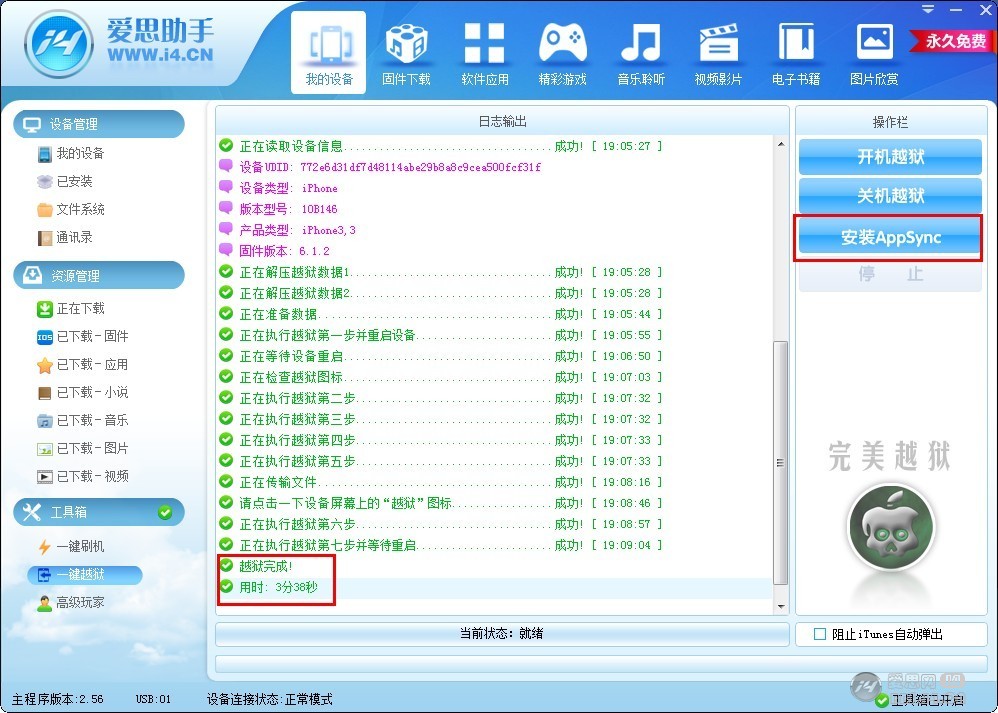 4. 之後越獄完成,但是注意不要著急拔下數據線,要“安裝Appsync”