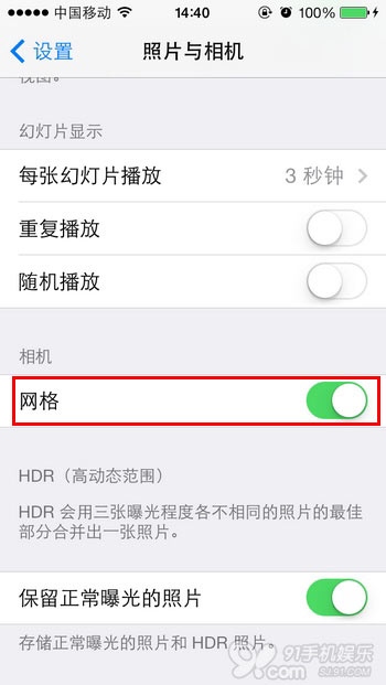 而在iOS7系統中,你需要進行設置中打開該功能才可以。具體操作:【設置】->【照片與相機】->開啟【網格】->然後再打開相機應用->你就會發現相機網格功能已開啟咯。