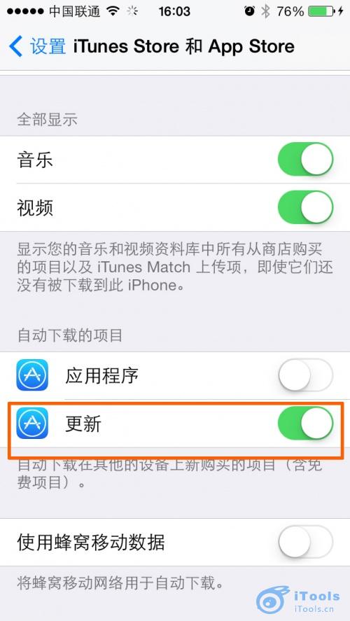 設置方法:設置-- iTunes Store和App Store -- 自動下載項目(更新)