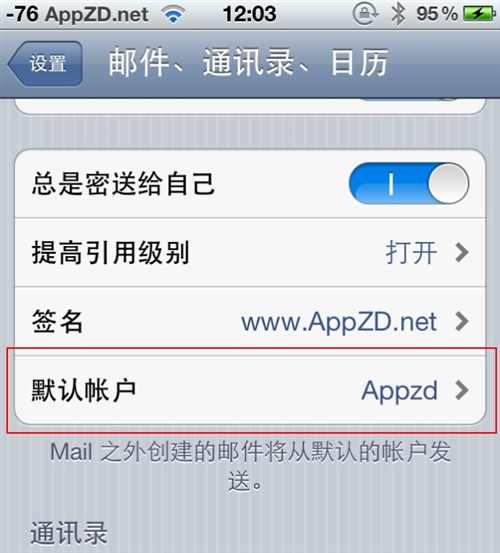 2.在郵件、通訊錄、日歷的設置頁面中拉到下面,選擇默認帳戶