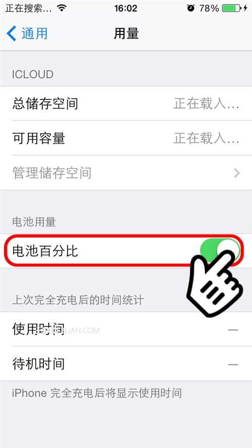點擊“用量”,往下滑動,如圖,找到“電池百分比”,用手指點擊將其打開,這時打開狀態顯示為綠色: