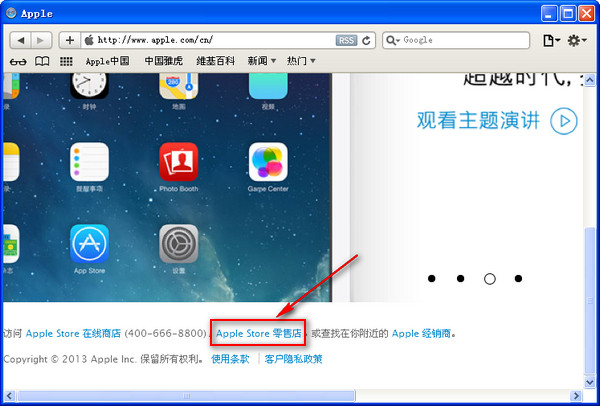 首先,進入蘋果官網http://www.apple.com/cn/(很多浏覽器不支持,在此小編推薦大家使用safari浏覽器打開:http://www.jb51.net/softs/33037.html),在頁面最下方,選擇前往零售店。