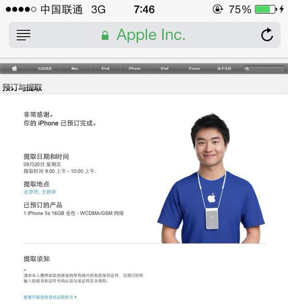 預訂成功者可於9月20日後陸續前往蘋果線下零售店自取。您可以通過蘋果在線商店和蘋果零售店的方式預定iPhone5s。據了解剛剛開啟預定香槟金顏色的iPhone 5s即告售罄,目前只有灰色與銀色可選。