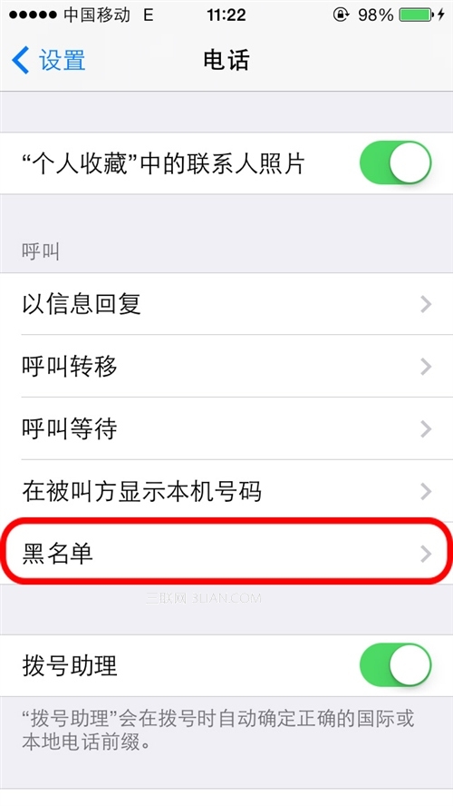 第1步:在iOS7系統新增加了一個黑名單的屏蔽功能,點擊設置,選擇信息,點擊黑名單功能選項。