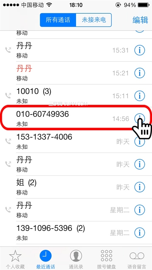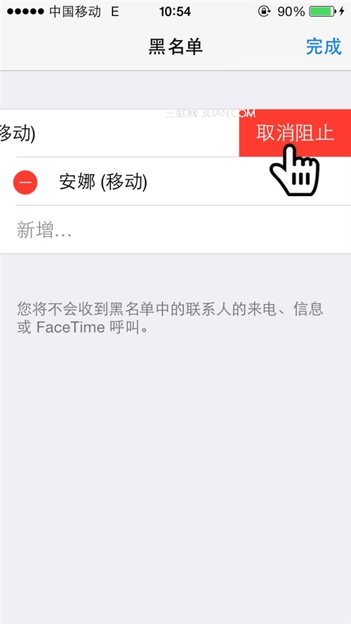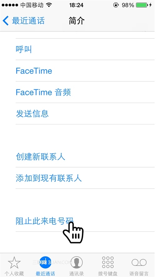 第4步:如果要攔截陌生的電話號碼,可以在最近的通話記錄中找到要阻止的電話號碼,然後點擊感歎號,進入詳細頁面,選擇阻止此來電號碼,阻止號碼後你將不會受到黑名單中的聯系人來電,短息和FaceTime呼叫。如果要取消阻止點擊取消阻止此來電號碼即可。