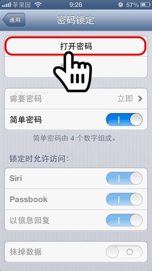 第4步:點擊“打開密碼”。蘋果有兩種密碼設置方式,默認為“簡單密碼”,由0-9的4位數字組成,方便用戶快速進行密碼設置。如果用戶想設置字母 數字的復雜多位密碼,就需要把“簡單密碼”開關關閉;