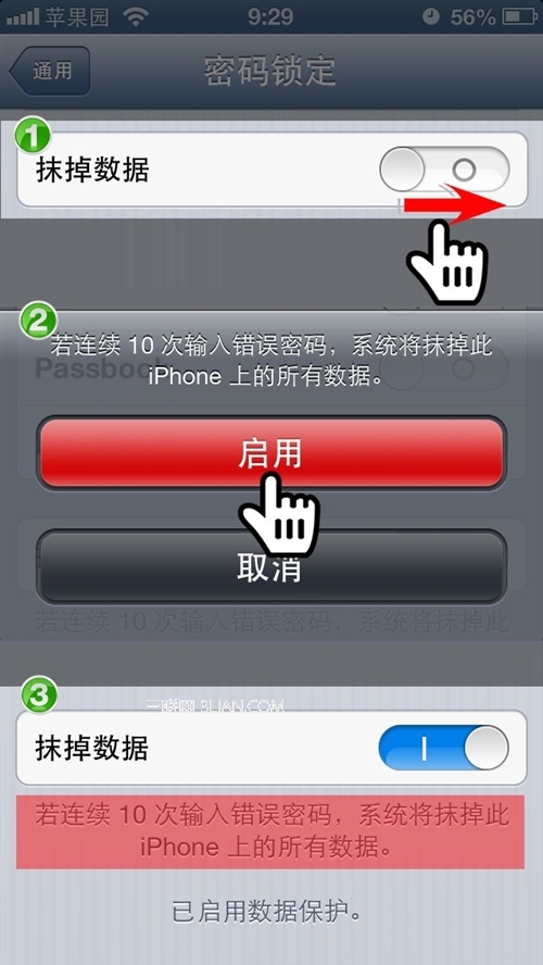 第7步:密碼設置完畢後立即生效,用記在該設置中還可以關閉密碼、更改密碼。還可以設置鎖定時允許訪問的程序,甚至還有一招更狠的:抹掉數據!用戶輸入密碼十次後,系統將抹掉該手機中的數據。對於手機遺失,該功能不失為避免數據被竊的最佳方案 ;