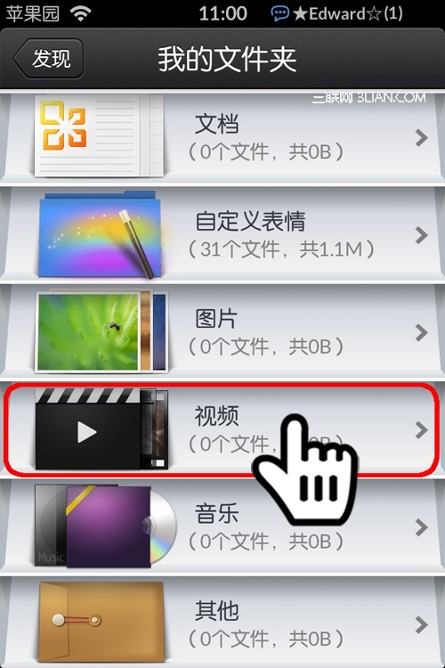 第3步:打開“我的文件夾”,可以看到裡面有很多的分類,這裡我們只用到視頻: