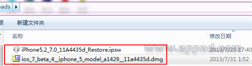 如果你還沒下載的話,就不要到處找了,iOS7 Beta4 for iPhone 5/4S/4、iPad 4/3/mini、iPod Touch5下載地址就有現成的IPSW文件,如果已經下載了,那也不用重新下載,簡單幾步就可以從dmg文件中提取中相應的IPSW文件。
