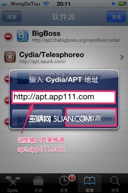 5.在這個彈框中輸入你要添加的源,這裡我們推薦蘋果核論壇的官方源:http://apt.app111.com 然後點添加源。