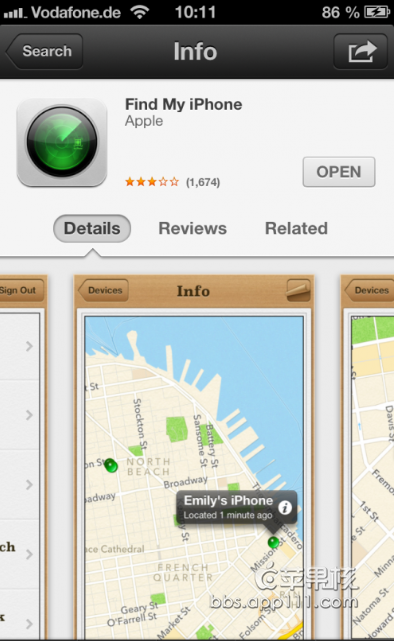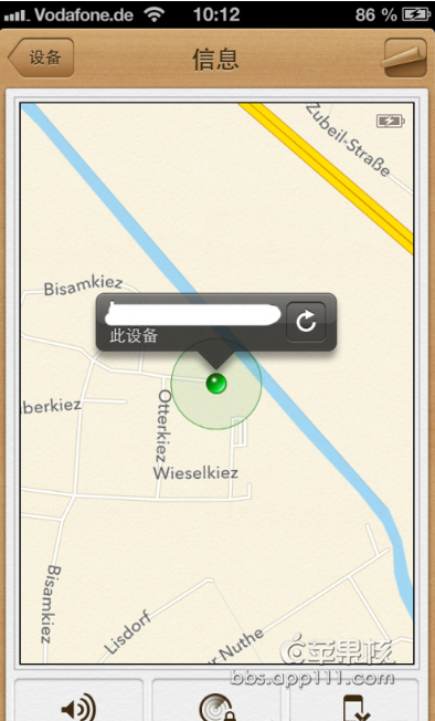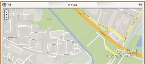 去蘋果應用商店Appstore下載“查找我的iPhone(Find My iPhone)”,立刻安上,用你的APPLE ID登陸上去。就可以看到你現在的位置(也就是你手機所在的位置)如下圖:
