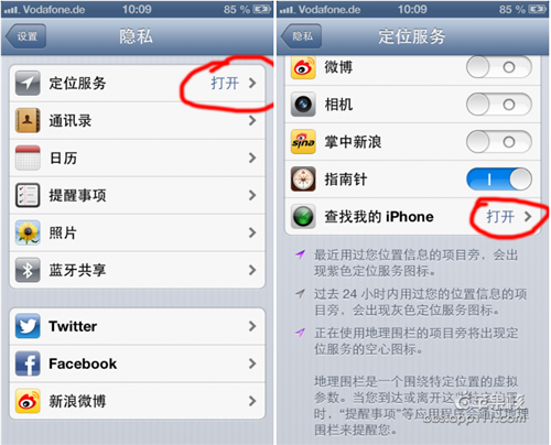 在設置--隱私--定位服務裡面打開手機定位系統,打開查找我的iPhone,並且一直保持開著的狀態,不要關閉。