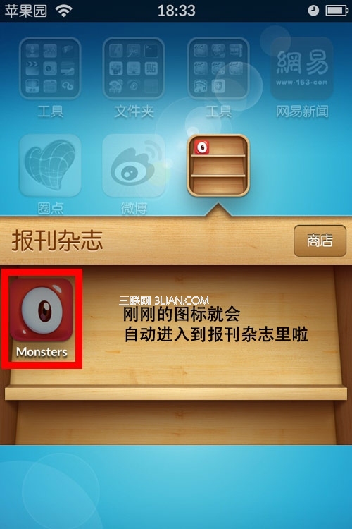 神奇的事情發生了!你剛剛按住的應用飛入到了報刊雜志裡面,如果失敗了不要氣餒,多嘗試幾次一定會成功: