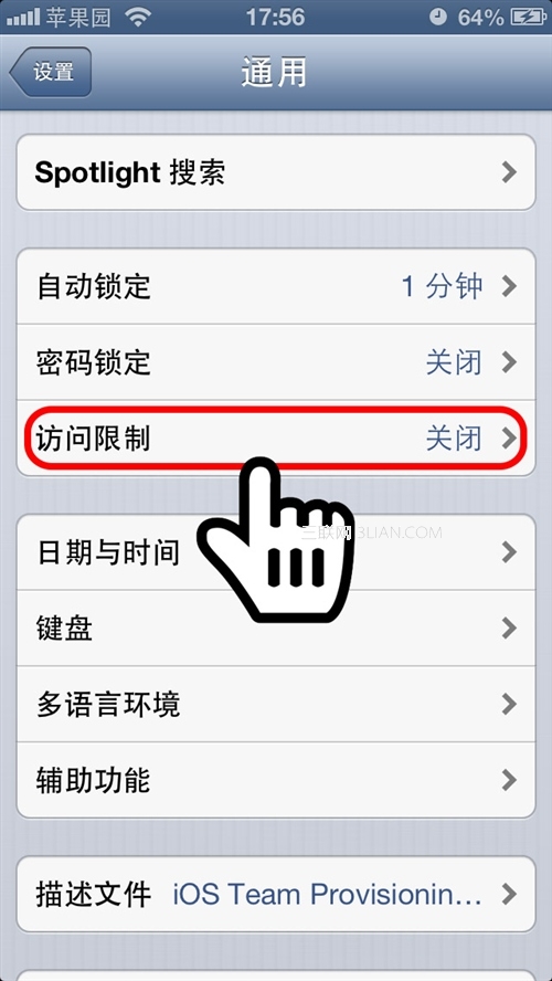 第3步:在“通用”設置中,找到“訪問限制”。默認狀態下,該項目為關閉狀態,接下來我們要把該選項打開才可以使用相應功能。如果您已經打開了“訪問限制”,輸入密碼後請跳到第7步;