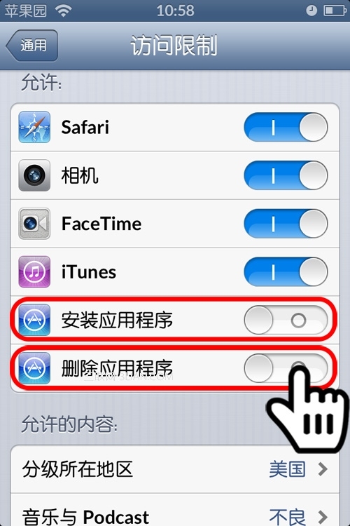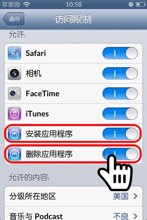 在iPhone中有刪除和安裝應用程序權限的開關,默認狀態為打開,我們只要將他們關閉,沒有密碼的情況下,就不能擅自刪除和安裝應用程序。以下是詳細步驟: