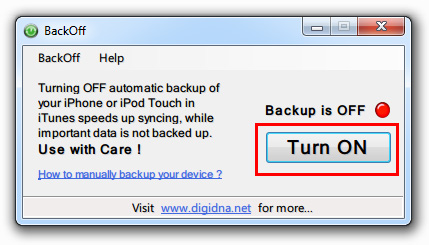 1.需要下載安裝Backoff軟件,點此下載。安裝並打開程序,點擊Turn OFF即可關閉,使用前請退出iTunes。