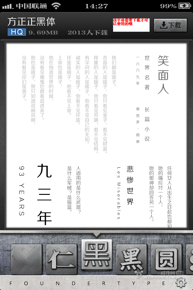 方正字酷只需打開換字程序,通過可視化界面,選擇喜歡的字體,點擊下載並使用,就可將iPhone系統的原有字體更換為心儀的字體。還可以進行默認字體恢復、刪除已下載字體操作。