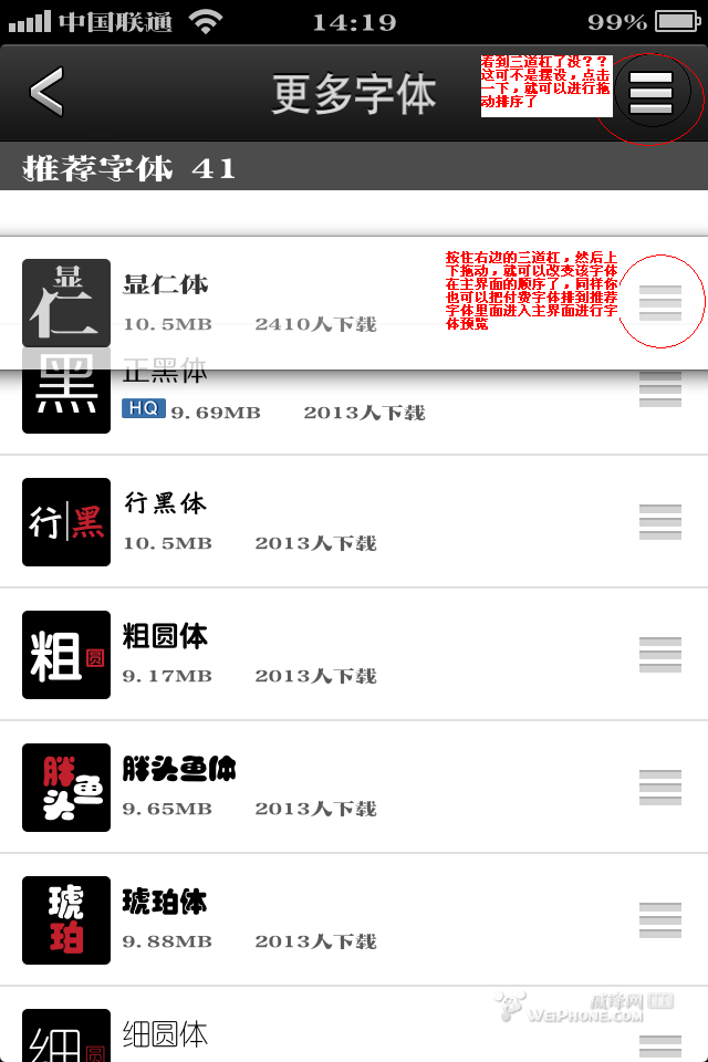 (1)排序。字體排序可以讓你輕松的不用購買付費的字體就可以預覽到改字體效果。需要點擊右上端的三道槓,然後將更多字體列表中的字體拖到推進字體列表裡回到主界面就可以預覽了