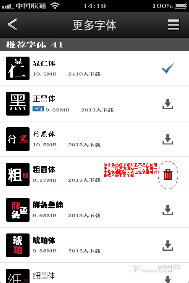 在更多界面你可以對字體進行排序,刪除下載過的字體。