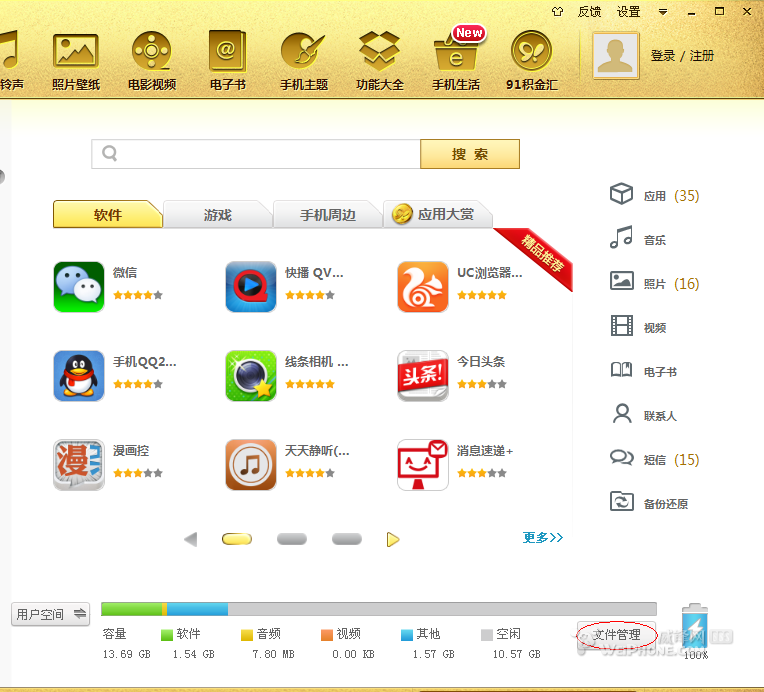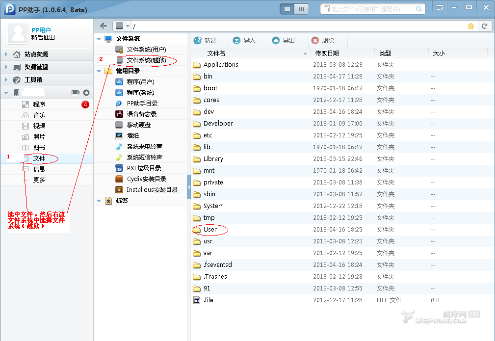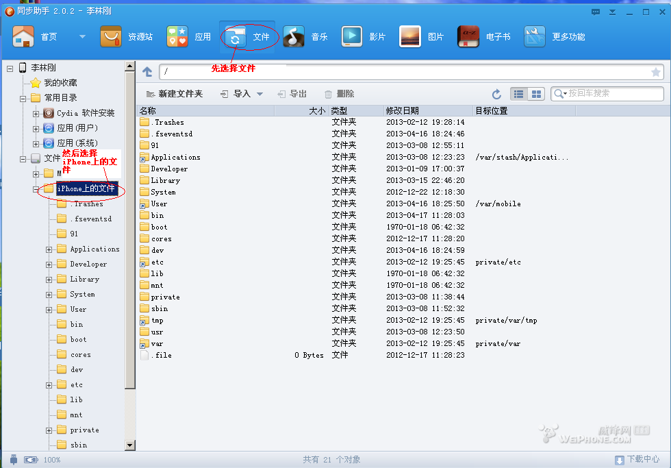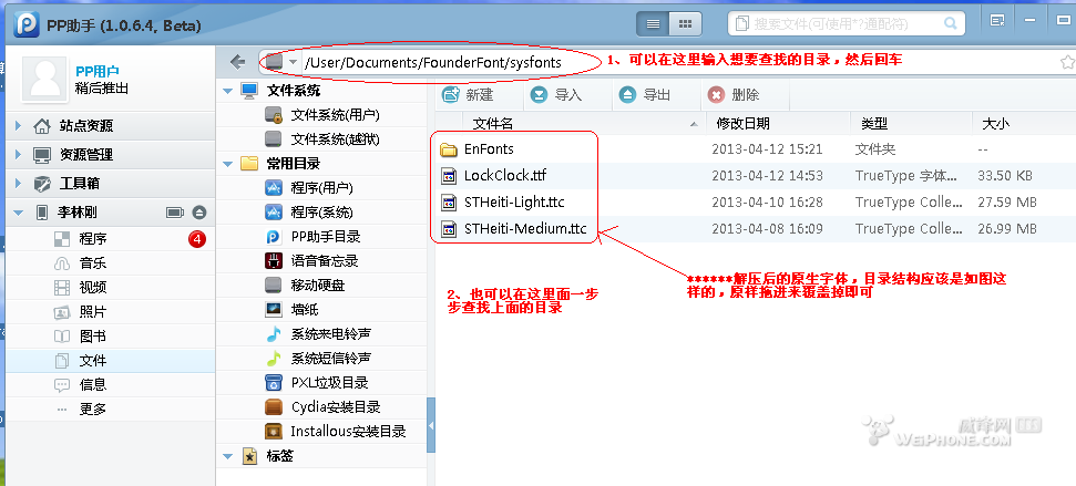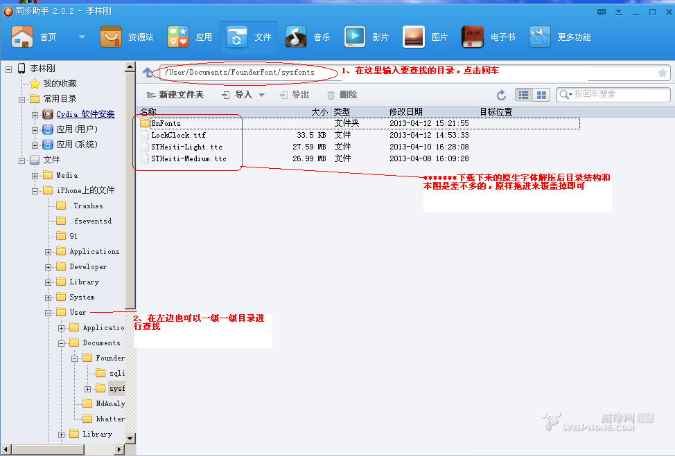 (2)手機得連接上電腦,然後用91助手或者pp助手或者同步推或者itools或者ifunbox之類的軟件,找到/User/Documents/FounderFont/sysfont/(方正字酷備份系統字體的目錄)將下載的原生字體解壓後原樣拷貝到該目錄即可