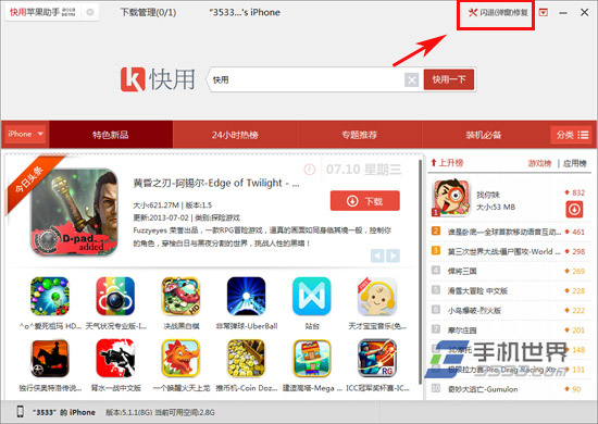 2)使用iPhone/iPad連接“快用蘋果助手”PC端,等待連接成功後點擊“快用蘋果助手”PC端主界面右上角的“閃退(彈窗)修復”按鈕。(如下圖所示)