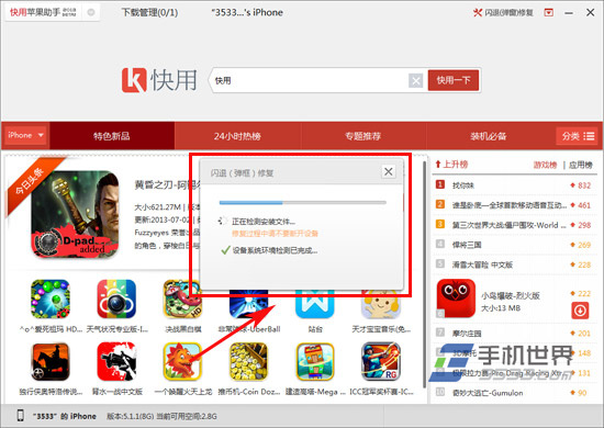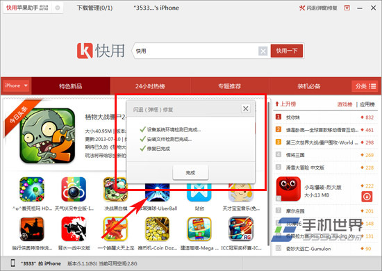4)待修復完成後,點擊確認。修復完成後關閉iPhone/iPad的移動版快用蘋果助手重新開啟就可以成功解決快用蘋果助手激活問題了。(如下圖所示)