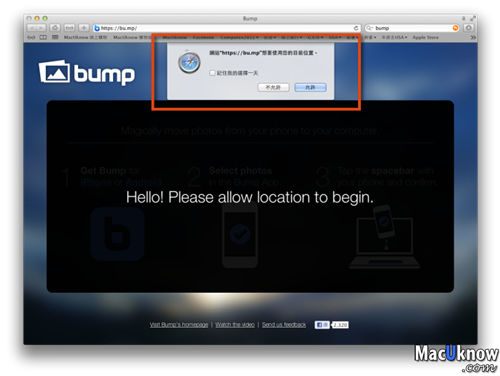 開啟浏覽器之後,例如Safari會跳出說,Bump想要存取你的位置資訊,請按下“允許”。