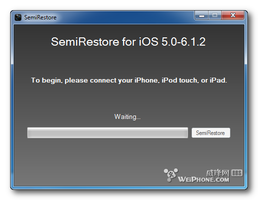 第六步:將你的 iPhone、iPad 或 iPod touch 連接電腦,注意設備運行的系統必須為 iOS 5.0 — iOS 6.1.2,然後點擊 SemiRestore 鍵。
