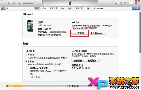 將手機連接到電腦上,打開itunes。在界面中我們可以看到“檢查更新”和”恢復iPhone”兩個選項。