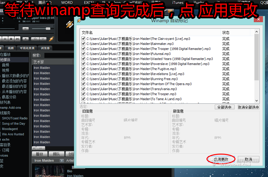 3.winamp會和數據庫連網查詢歌曲信息。查詢完成後,點應用,即可將正確TAG信息寫入歌曲