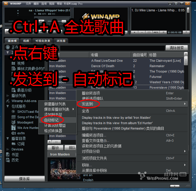 2.Ctrl+a 全選歌曲;點右鍵、發送到-自動標記