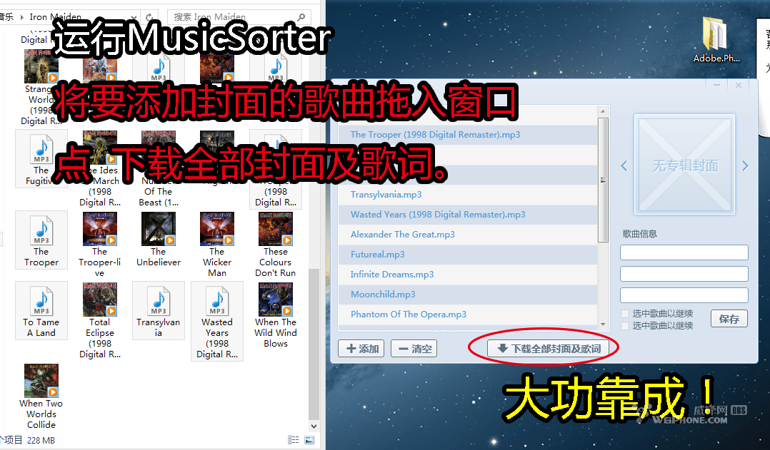 運行MusicSorter,將歌曲拖進窗口,點擊下載全部封面及歌詞。
