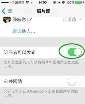 2、升級到iOS7後可以看到訂閱人物的欄目裡面增加了一個【訂閱者可以發布】的按鈕,這個按鈕就是官方宣傳片中所講到的分享照片到你創建的相冊裡面的關鍵點。如果不打開該功能按鈕,你的訂閱者是不可以分享照片到你的相冊裡面的,也是官方宣傳片中沒有講到的。iOS6升級到iOS7的時候,這個功能按鈕默認是關閉的,需要手動進行開啟方可允許朋友分享照片到你的相冊。