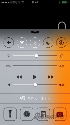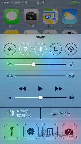 控制中心集成了可5個常用的功能開關,另外還有亮度調節,音樂控制等,這些原本雙擊home鍵實現的功能都被放在了這。