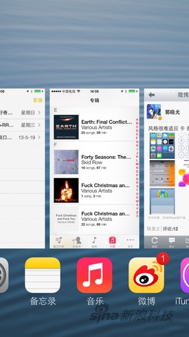 剛才談到雙擊home鍵的事,如果在iOS 7系統上再做這個動作,你會看到一個類似WebOS的卡片式進程管理器,上面是卡片式進程管理,下面是它們的圖標,並且卡片是動態的(例如攝像頭仍在取景)。