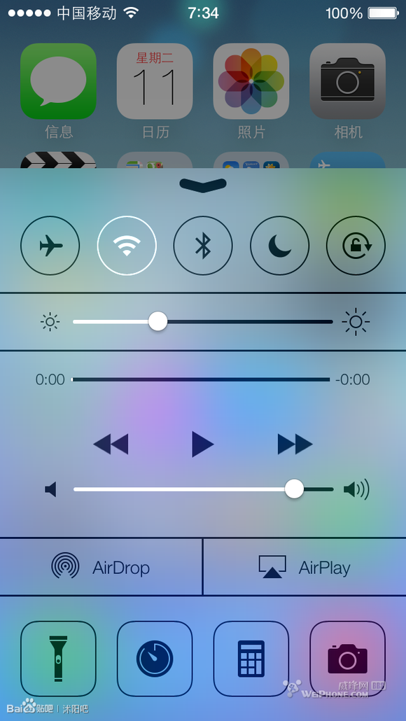 在任何界面(包括鎖屏界面),從最下排Dock向上滑動,會看到新增的向Android學習的便捷設置欄,可以方便地一鍵修改飛行模式、無線、藍牙、勿擾模式和解鎖,還能調整亮度、調整音樂播放控制,選擇AirDrop(Mac中引入的無線傳送文件)、AirPlay,方便地打開閃光燈(App Store的手電程序可以去死了)、時鐘、計算器和相機。
