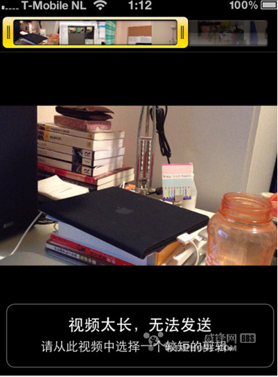 如果拍的視頻太長,在拍完以後會見到警告信息“視頻太長,無法發送”,這個時候沒關系,只要點左下角的“取消”回到信息編輯界面,再點右上角的“取消”鍵,就可以了。