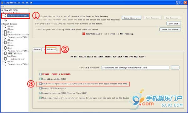 步驟6:在TinyUmbrella點擊Advanced(高級),去掉“SetHoststoCydiaonExit…”前面的鉤,然後關閉TinyUmbrella。