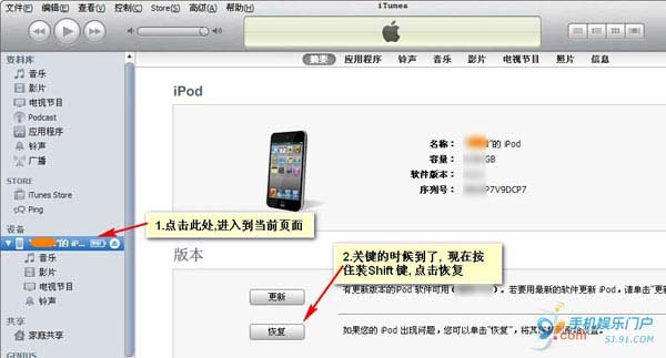 步驟4:打開iTunes,按住鍵盤Shift鍵同時點擊恢復(mac用戶按住Option的同時點擊iTunes的恢復鍵),選擇IOS4.3.3固件。