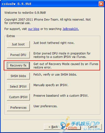 步驟7:再打開RedSn0w > Extras > Recoveryfix(恢復修復),此時i設備屏幕出現類似越獄過程的顯示,然後又回到黑屏。