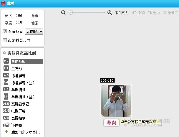 打開自己的照片,采用美圖秀秀編輯,點擊右上角裁剪,在裁剪裡面,設置寬度,高度(一般滑塊高度,寬度在110像素左右)