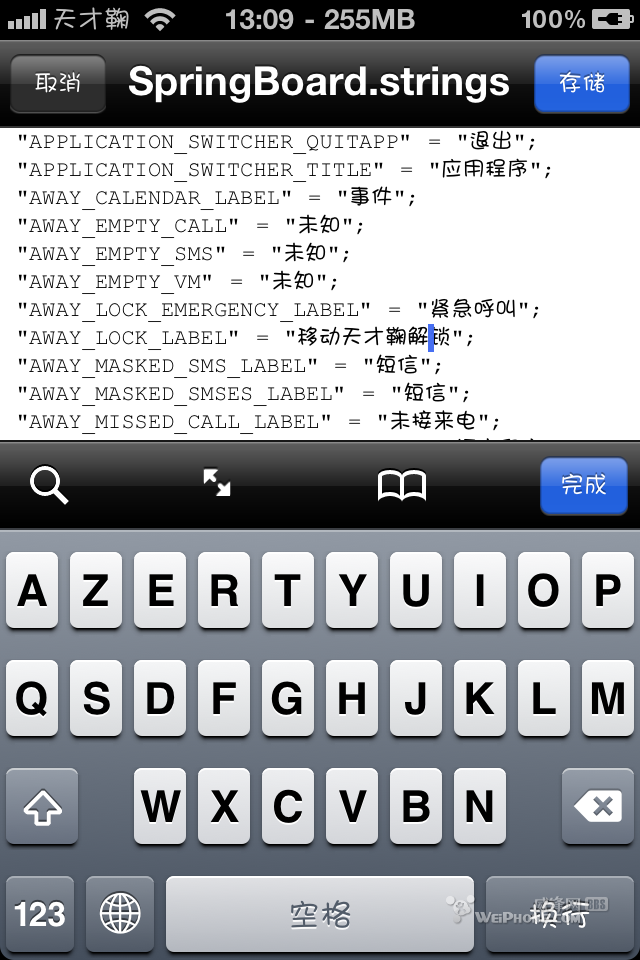 最後點擊SpringBoard.strings,文本編輯器打開,找到移動滑塊來解鎖,點左上角編輯,寫成你想寫的字,最後存儲,完成,重啟就好了