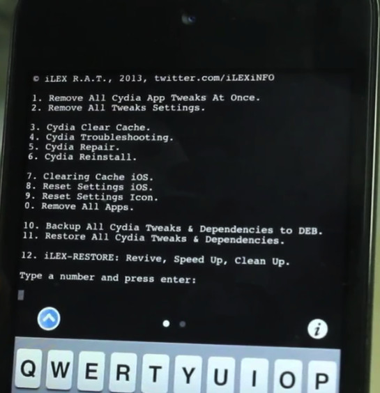 4、打開設備上已安裝的MobileTerminal ,鍵入 "Rat" (不包括雙引號) ,然後按設備虛擬鍵盤上的“return”。 之後iLEX RAT自動加載數據,會列出12個功能選項,其中前10個是之前版本就有的,現在新增的最後一個選項,即第12個選項,就是恢復設備了。