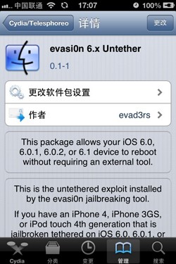 如果您的iPhone 4或者iTouch 4已經是iOS6不完美越獄了,那麼直接運行cydia,搜索evasi0n 6.X Untether,並安裝,重啟設備,就能變成完美越獄了。