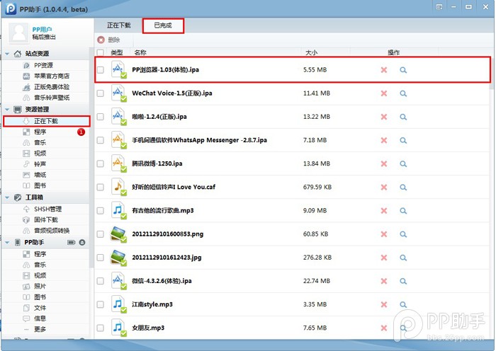7.在資源管理的【程序】選擇剛才下載成功的應用程序點擊【安裝】,即可安裝到成功連接PP助手的iOS設備;