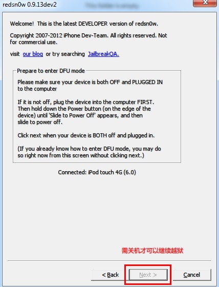3、此時將設備接入電腦,然後按住電源鍵,滑動出現的滑塊來關機,最後點擊“Next(下一步)”: