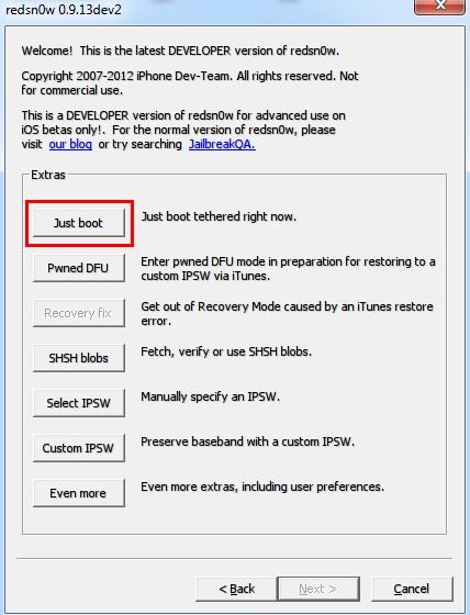 6、再次打開紅雪,然後依次點擊“Extras(其它)”、“Just boot(引導啟動)”。然後按照屏幕提示進行操作即可完成引導啟動。不完美越獄完成!