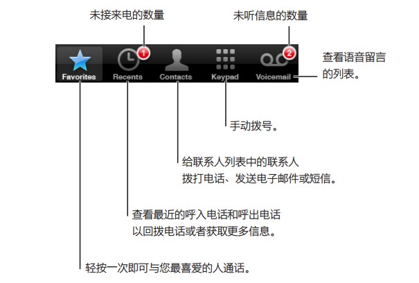 2. 選擇 “個人收藏”、“通訊錄”、“最近通話”電子郵件、短信或iPhone 內幾乎任何位置中的電話號碼,進行撥打電話。或者輕按“撥號鍵盤”來手動撥號。若要將來電靜音,請按下手機右上角的開 / 關按鈕一次,或者將手機左側最上面的靜音鍵調至靜音模式。若要拒接來電,請按下開 / 關按鈕兩次。